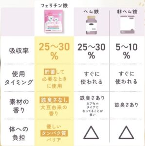 鉄分の種類としては、大豆由来「フェリチン鉄」が用いられており、味・匂い・飲みやすさに配慮された商品となっています。